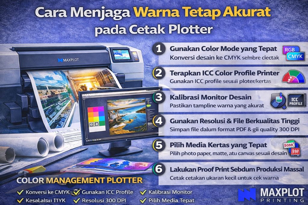 Menjaga warna tetap akurat membutuhkan kombinasi setting file, profil warna, dan mesin plotter berkualitas. Untuk hasil terbaik, gunakan layanan cetak profesional yang memiliki kontrol warna terkalibrasi.