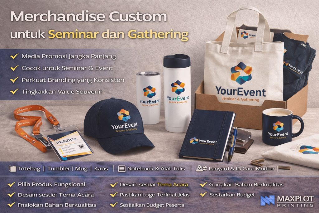 Di Maxplot Printing, kami menyediakan layanan merchandise custom untuk seminar dan gathering dengan berbagai pilihan produk, teknik cetak berkualitas, dan produksi cepat sesuai kebutuhan event Anda.
